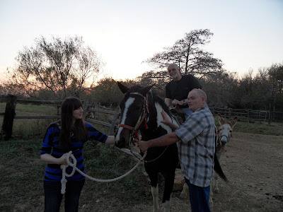 Dad decided to try it out, too... but apparently to get a good picture, he needed some temporary help from me and Jen's husband, Larry. (I love how the donkey is peeking out from behind Larry...)